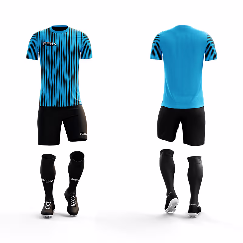 Najwyższej jakości, sublimowane stroje piłkarskie dla dzieci PEHA Velez oferujemy w niezwykle atrakcyjnej cenie, zapewniając profesjonalny wygląd drużyny przy pełnej kontroli kosztów klubowych. Komplety piłkarskie PEHA szyjemy z funkcjonalnego, 100% poliestru Coolmax o właściwościach oddychających. Funkcjonalny materiał skutecznie odprowadza pot z ciała zawodnika oraz zapewnia optymalną wentylację, minimalizując ryzyko przegrzania organizmu. Dzianina Coolmax jest jednocześnie lekka, przyjemna w dotyku i wyjątkowo wytrzymała, co gwarantuje wysoki komfort użytkowania i długą żywotność stroju. Do produkcji strojów stosujemy technikę sublimacji, dzięki czemu nadruki są trwałe i praktycznie niezniszczalne ponieważ stają się integralną częścią materiału. Pozwala to uzyskać światowej klasy design o oryginalnym, ponadczasowym wzorze, który skutecznie przyciąga uwagę zarówno drużyny przeciwnej, jak i kibiców.